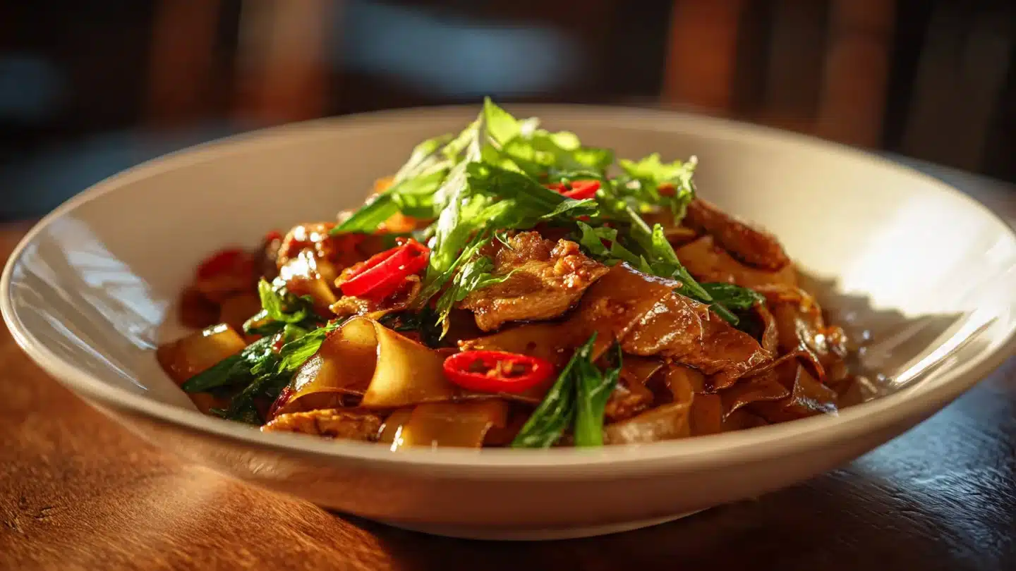 The star here is wide rice noodles—chewy, slippery, and perfect for soaking up bold sauces.