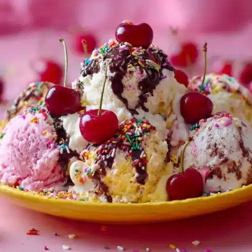 Add three scoops of vanilla, chocolate, and strawberry ice cream between the banana halves. Yes, the classic trio—don’t skip it unless you enjoy chaos.