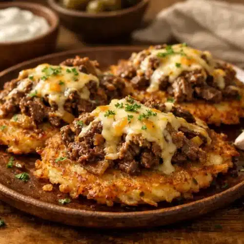 These potato pancakes stuffed with savory beef and cheese deliver comfort, protein, and crowd-pleasing flavor in every bite.