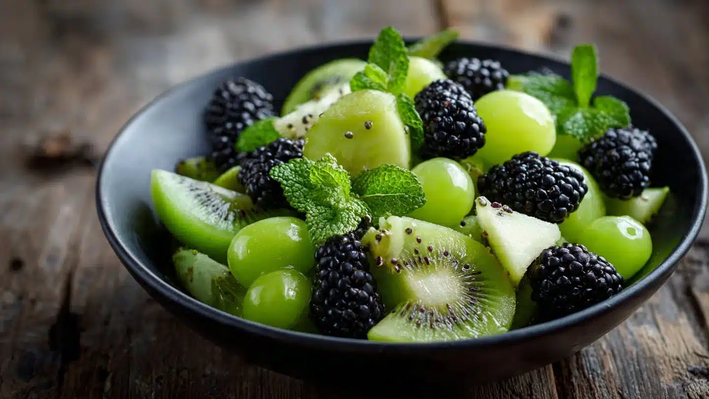 I choose kiwi, green grapes, and honeydew specifically for their color and contrasting textures. I rarely add food coloring because real fruit looks better and tastes better.